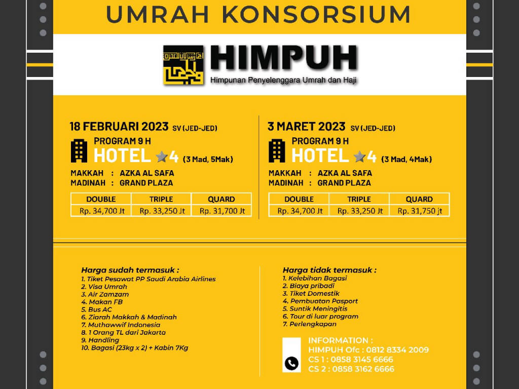 Umrah Konsorsium Himpuh 18 Feb 2023 Paket hotel 4* (B to B only)